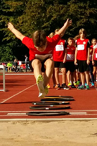 So starteten also die Turbo Adler mit einem großen Fragezeichen – würden die kleinen Athleten auch in den neuen Disziplinen punkten und vorne mitmischen können? Die 6*50m Staffel wurde gleich zu Beginn als drittschnellste Mannschaft (43,81Sek) gelaufen. Beim 5-Sprung zeigte sich das intensive Training und es gab gleich mehrfach Sprünge um und über die 3 Meter. Beim Drehwurf flogen die ersten Versuche nicht immer dahin wo sie sollten, aber die Turbo Adler ließen nur kurzfristig die Flügel hängen und ermutigten sich gegenseitig und siehe da! Im Verlauf wurden die Würfe immer präziser und weiter und die Stimmung stieg. Im Anschluss kam die nächste Kraftprobe – das Stoßen. Hier brachten einige Adler das Kampfgericht gehörig ins Schwitzen – gleich reihenweise wurde bis über die letzte Markierung – immerhin 24 Meter gestoßen. Das war so im Vorfeld nicht abzusehen gewesen und umso beeindruckter waren Eltern und Trainer.